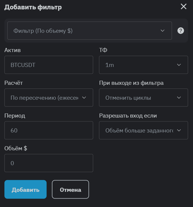 **По объему $** – данный фильтр считает общий объем стейблкоинов ($) за указанное количество прошедших баров. На основании которого можно разрешить или запретить открывать сделки.